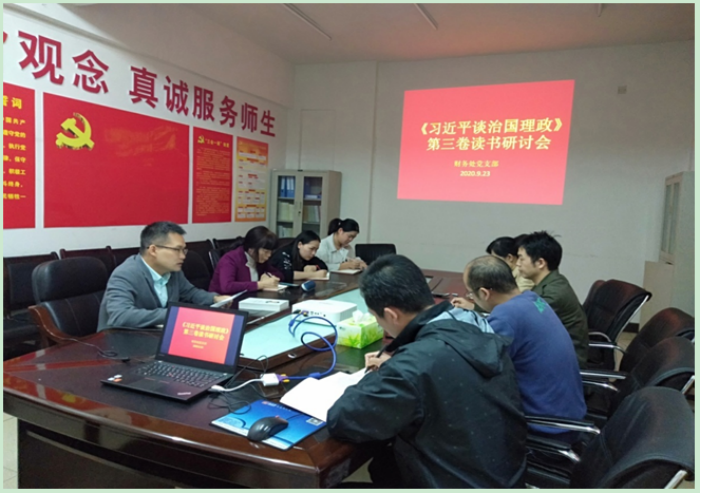 9月23日下午,财务处党支部在创业园214会议室举行《习近平谈治国理政》(第三卷)读书研讨会。财务处党支部9位党员参加了研讨会,会议由支部书记蒋辉同志主持。