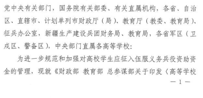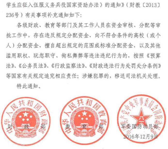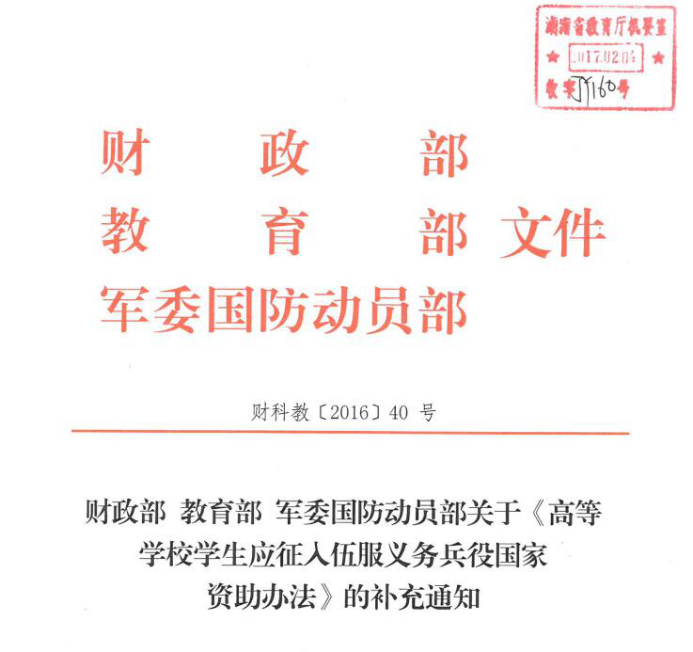 关于《高等学校学生应征入伍服义务兵役国家资助办法》的补充通知