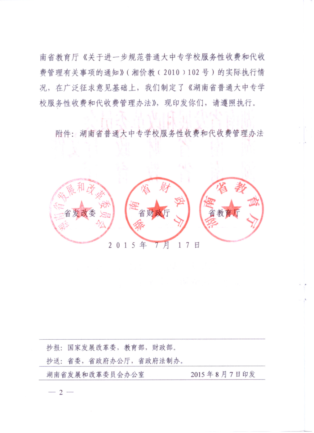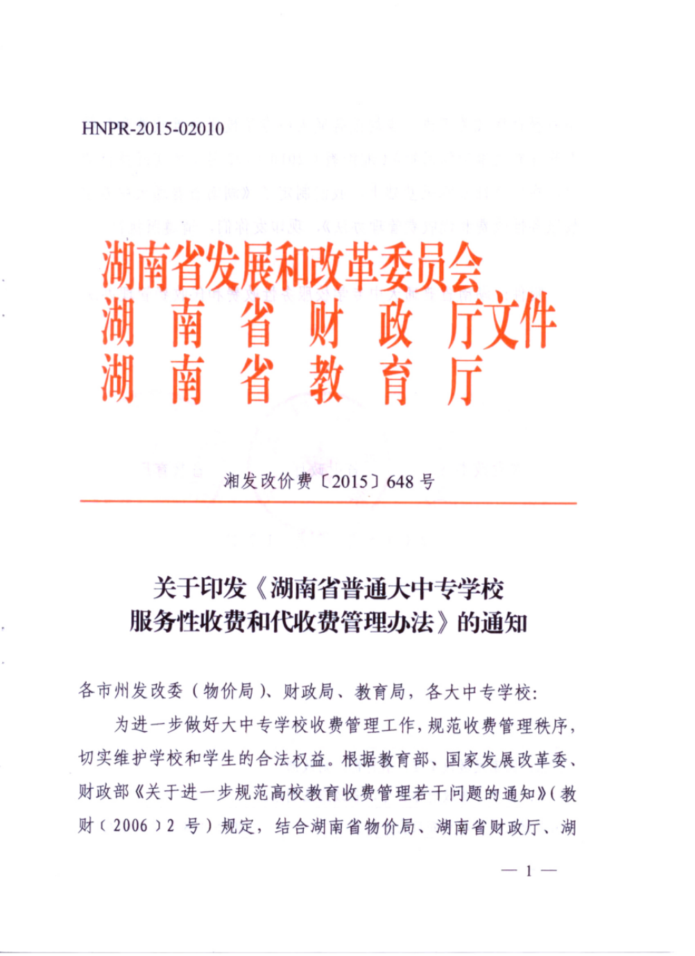 湘发改价费[2015]648号 《湖南省普通大中专学校服务性收费和代收费管理办法》