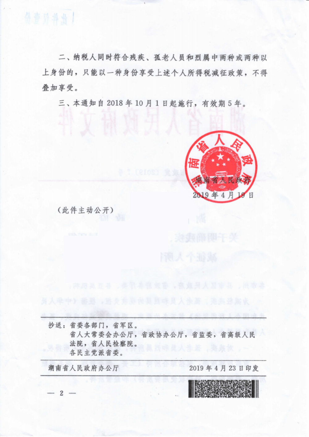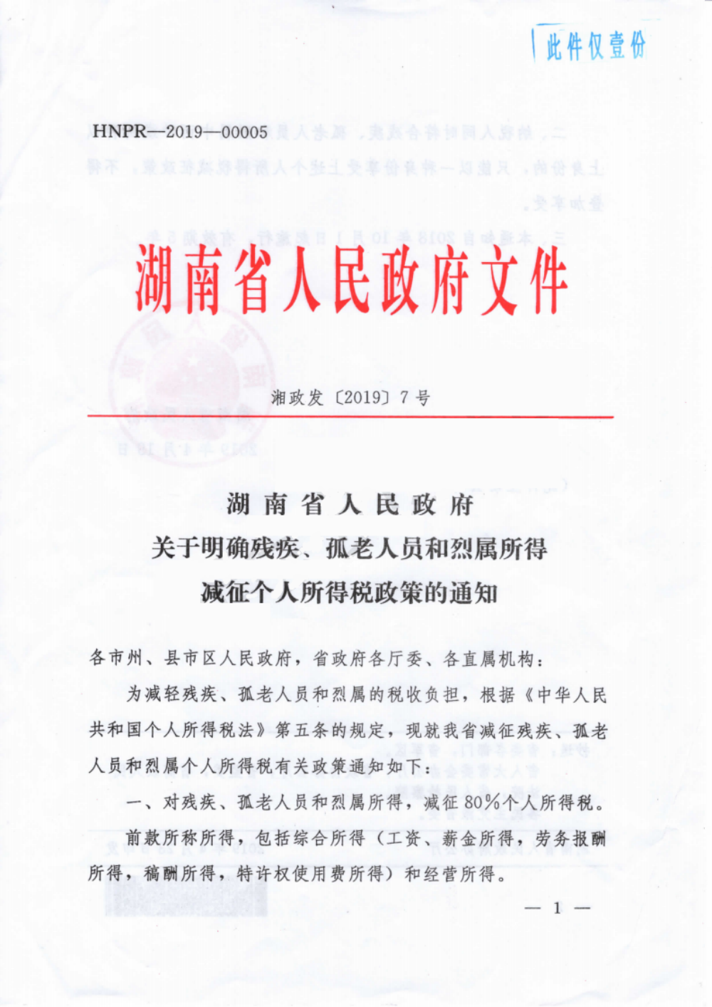 湘政发【2019】7号 湖南省人民政府关于明确残疾、孤老人员和烈属所得减征个人所得税政策的通知